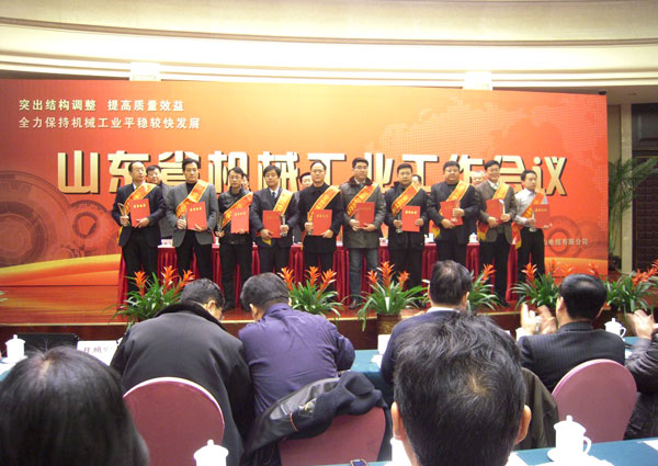 1月10日,山东省机械工业工作会议在泰安市东尊华美达酒店隆重召开,中国机械工业联合会特别顾问朱森第、山东省机械工业协会会长刘卫东、泰安市副市长闫新建等领导出席会议并颁奖。公司董事长、总经理康凤明,常务副总经理潘宪平、副总经理康峰等领导参加会议。董事长、总经理康凤明荣获“山东省机械工业优秀企业家”称号,副总经理朱洪臣荣获“山东省机械工业有突出贡献科技专家”称号,副总经理康峰荣获“山东省机械工业优秀企业(行业)管理工作者”称号。