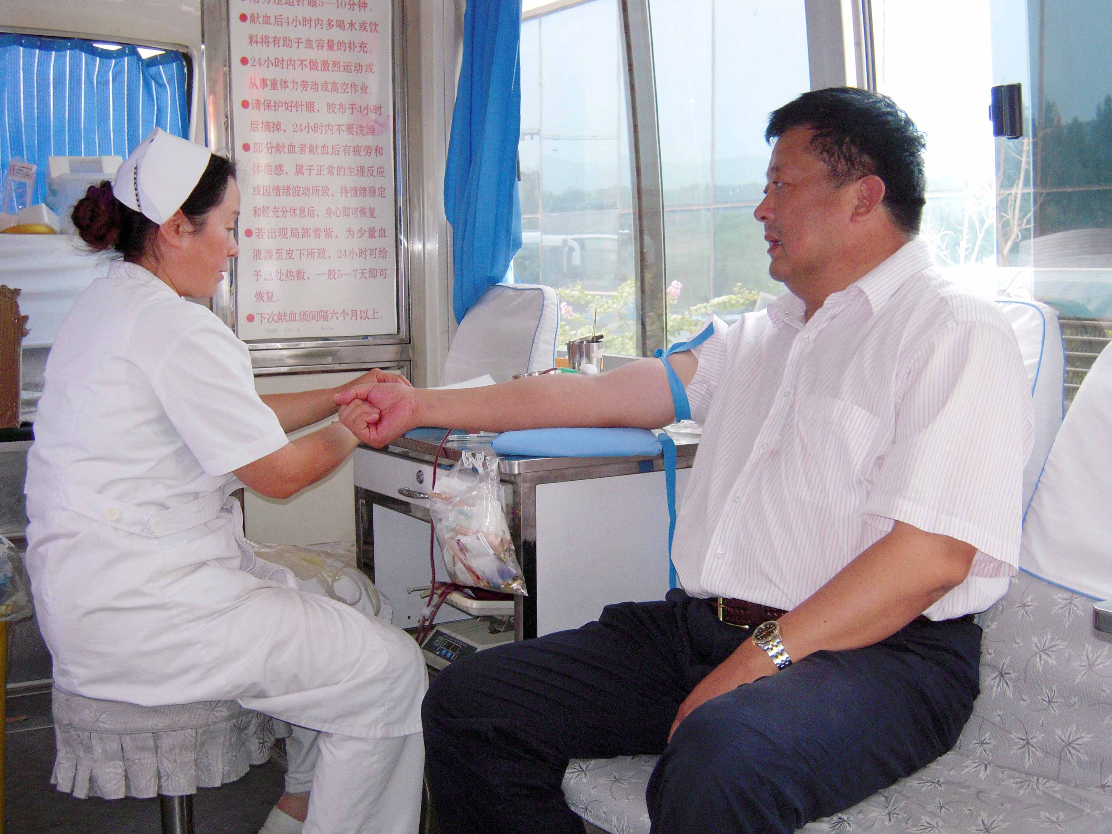 | ▲董事长、总经理康凤明带头献血 | ▲副总经理朱洪臣献血 |